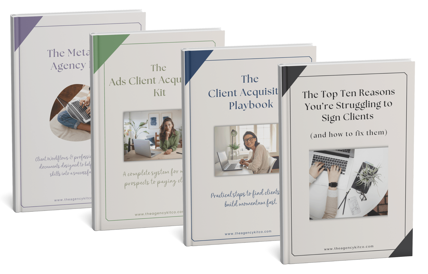 If you work with ads, The Client Acquisition Kit provides a full set of pre-written, done-for-you documents that support the entire Client Acquisition process. It includes all the client facing documents, internal documents and emails you need. It also includes a detailed 3-stage workflow checklist that guides you through the practical steps from the discovery call to receiving payment and shows you which documents to use at each stage.